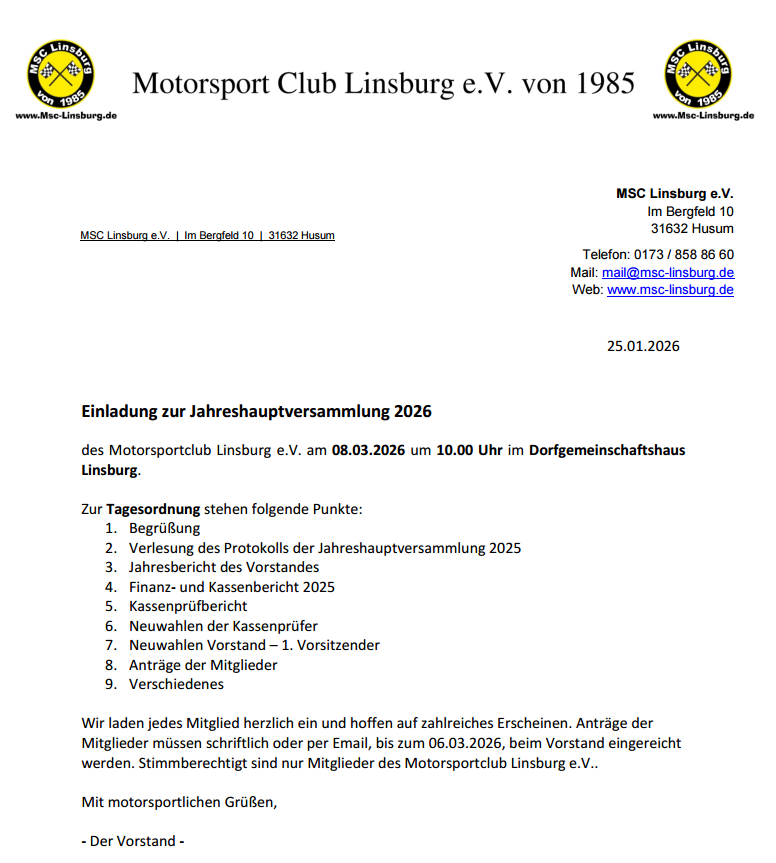 werden. Stimmberechtigt sind nur Mitglieder des Motorsportclub Linsburg e.V..